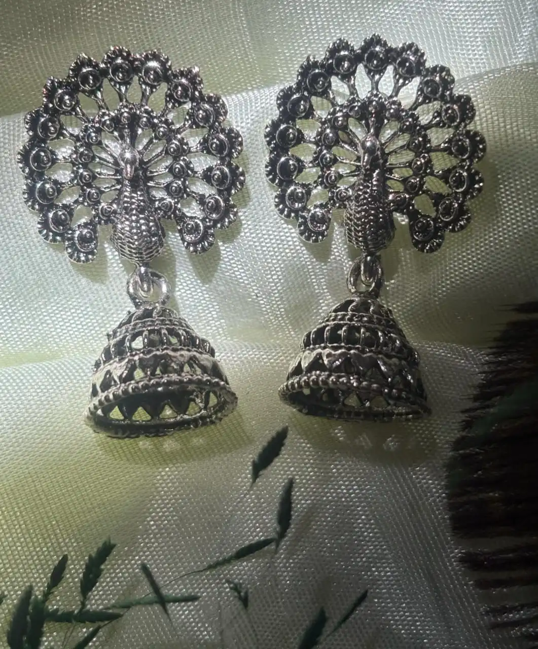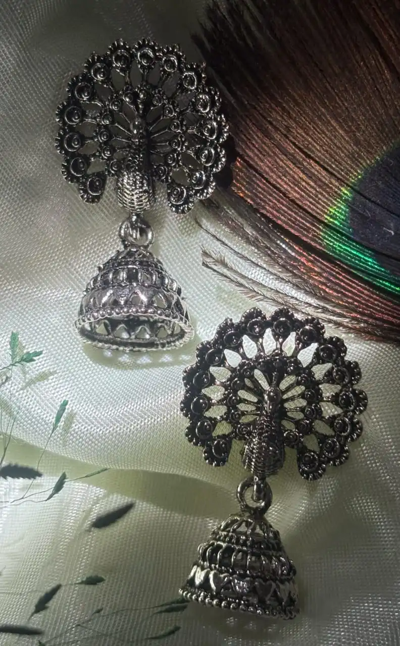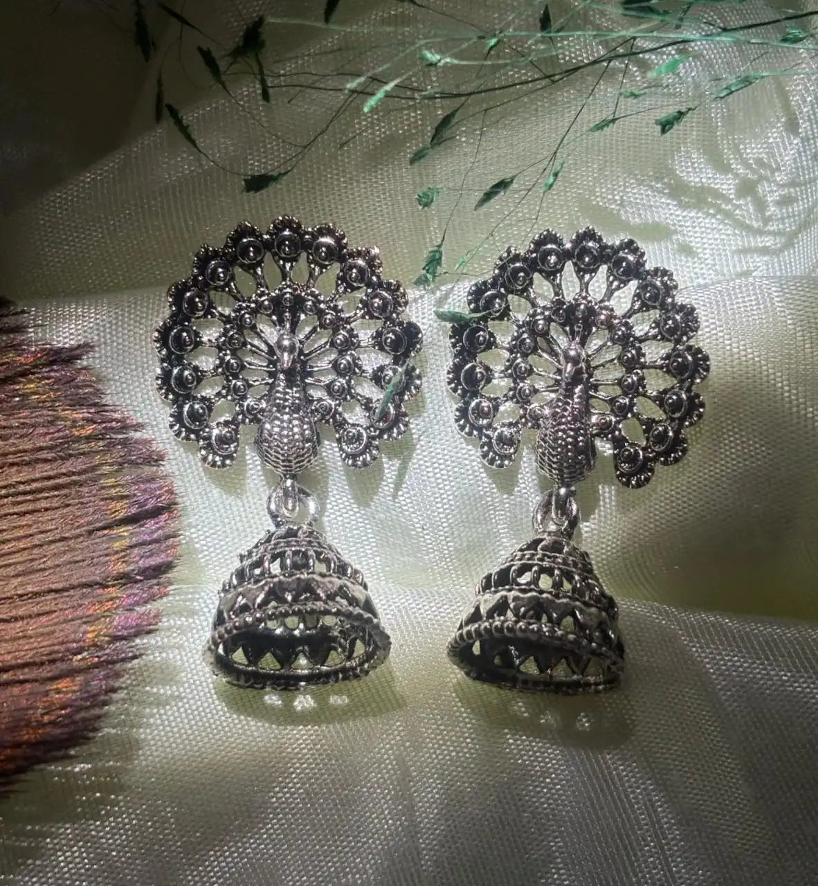 These earrings feature a beautiful peacock motif at the top, showcasing detailed craftsmanship with an ornate, fan-like feather design. Hanging below is a classic jhumka-style bell, designed with traditional cutwork and antique-style detailing.